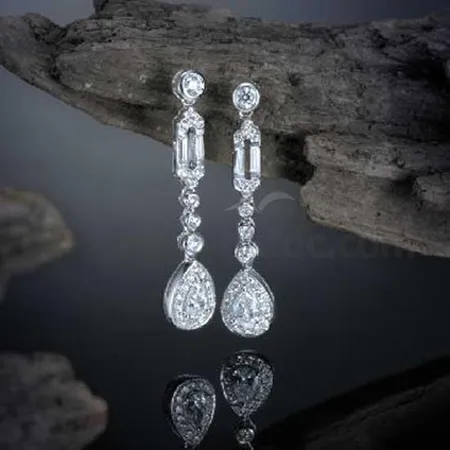 The displayed earrings come with three round decorations in-between a cutout decoration and a teardrop decoration. They are accented with G/VS diamonds for an eye-catching look. These earrings add extra spice to your elegant look in an instant.