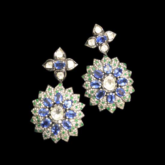 This is a pair of earrings that boasts a flower-shaped design. It is exquisitely decorated with colorful sparkling diamonds and shimmering Kynid stones. Enhance your look with these beautiful earrings for a deluxe and unique touch.