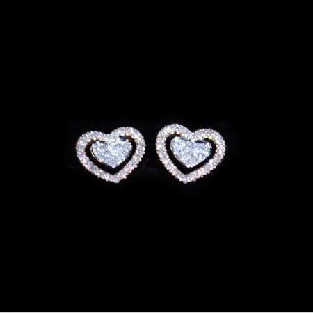 These heart-shaped stud earrings feature twinkling white diamonds set in white and rose gold. The earrings are finely designed and made with exquisite details. These lovely heart earrings are perfect for accessorizing for young ladies.