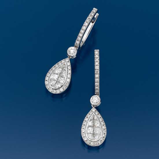 The pair of diamond earrings is constructed of 18k platinum for a dash of luxuriousness. Each earring is hung with a pear-shaped decoration dressed with invisibly set diamonds. The earrings are a great idea for you to highlight and prettify earlobes.