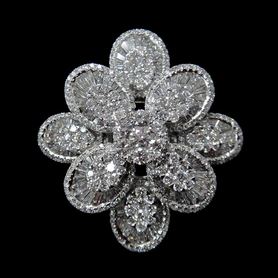 This pictured ring is topped with a flower assembled with gleaming diamonds, The petals are set with baguette and round diamonds for endless sparkles. The ring also employs 18K gold in its construction for added value and charm.