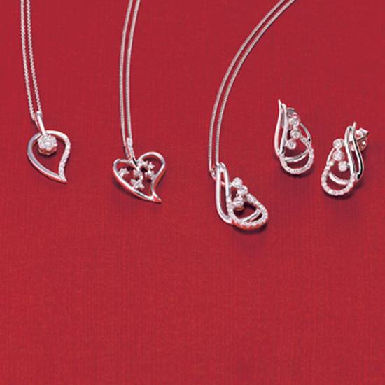 The featured items are from a series of diamond pendants and earrings in various designs. The pendants are in open work designs and diamonds are set on the pendants to add spaeks to its silvery design.