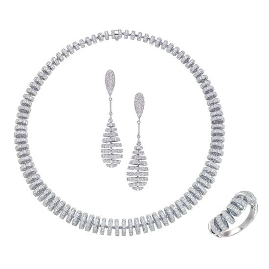 This set of diamond jewellery includes a necklace, ring and pair of earrings. The necklace and the ring are designed with the same pattern, in which a lot of round circles are connected with a chain. At the first glance, they do look like a combination of numerous full-circle rings. The earrings features a similar pattern, but the sizes of those circles are apparently different from each other, and the earrings actually resembles a pear-shaped decoration.