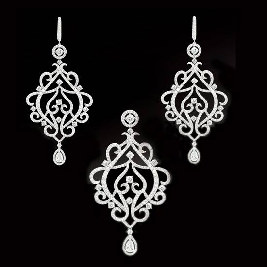 This jewellery set contains a pair of earrings and a pendant in scroll motif. The earrings has a diamond drop that matches the pendant. Diamonds are micro set and arranged in a special pattern.