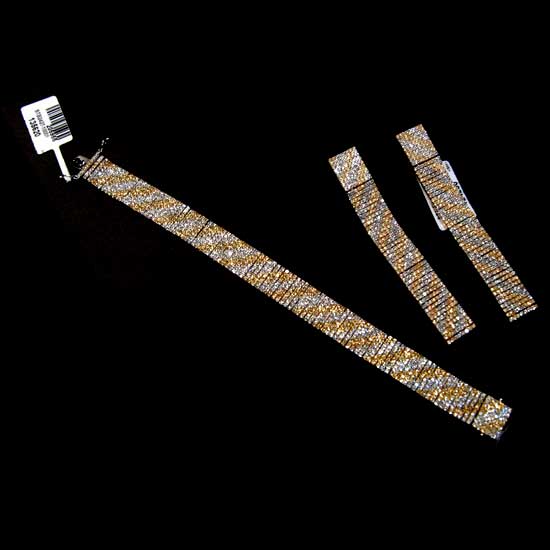 The jewelry set includes a bracelet and a pair of earrings in a delicate design. Each item is embellished with golden and white diamonds, forming stylish slant patterns, showcasing a touch of sophisticated glamor. This jewelry set makes an exceptional way to enhance your grand ensemble.