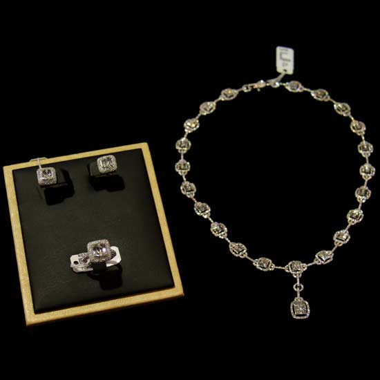 The luxurious jewelry set includes a necklace, a ring and a pair of earrings in an elegant design. Perfectly embellished with sparkling diamonds, the necklace radiates irresistible beauty with the well-executed square-shaped adornments. The delicately crafted jewelry set makes a pretty way to complement your fine jewelry collection.