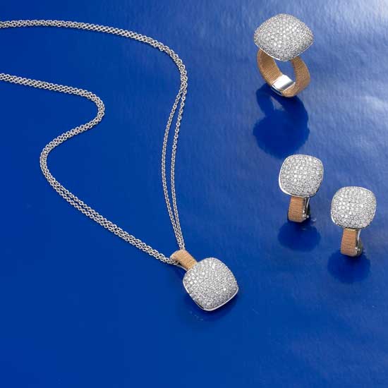 This outlined diamond jewelry set includes a pair of earrings, a ring and a necklace. Each piece is adorned with petite diamond stones to flaunt brilliance. This jewelry set is a glamorous accessory to wear with long dresses.