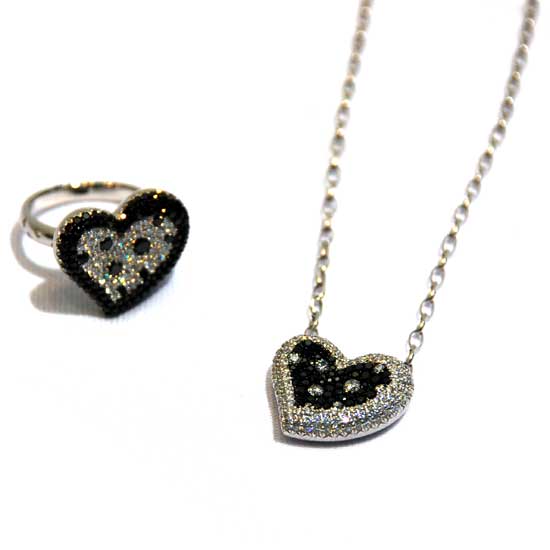 The diamond jewelry set comprises a finger ring and a necklace. The heart-shaped design conveys a touch of romance. This jewelry set is adorned with white and black diamonds.