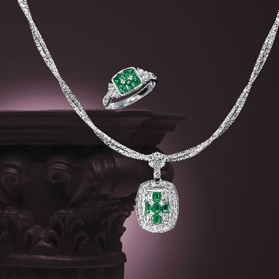 This diamond jewelry set comes with a necklace and a finger ring. The diamond pendant is embellished with green stones arranged in a cross shape. This diamond jewelry set