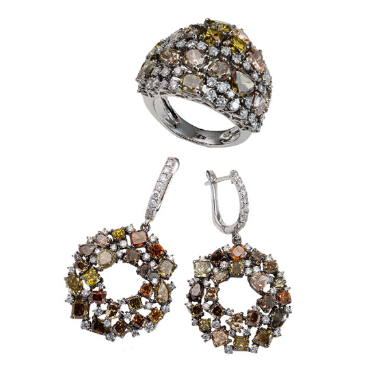 This is a jewelry set that includes a pair of earrings and a finger ring with a matching design. The colorful gemstones and brown diamonds are well mounted on the 18-karat white gold setting. This refined jewelry set is an ideal addition to complete your fashion collection.