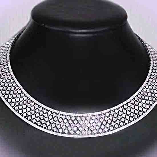 This beautiful necklace features a high-quality 18K white gold construction. It comes with a thick strap-like design with dazzling white diamonds all over. This gorgeous diamond necklace makes a perfect addition to your jewelry collection.