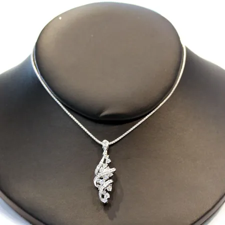 This necklace comes with a stylish and fashionable design. It is crafted with dazzling diamonds on the 18K white gold setting for an eye-catching look. This diamond necklace complements your outfits nicely.