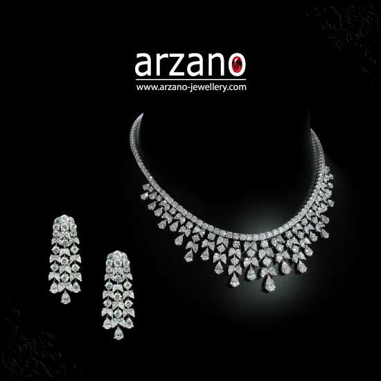 This vintage-style necklace and earrings feature a delicate cascading design with diamonds accent. The jewelry exhibits irresistible shine from any angle. The jewelry set is manufactured in the Swiss standard with certified diamonds.
