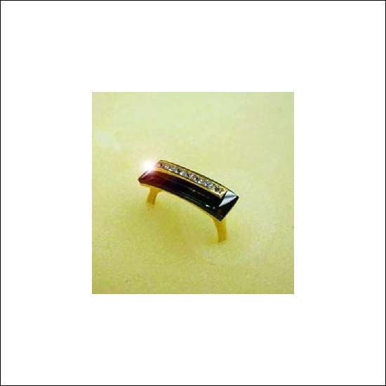 Round cut diamonds are in half channel bead setting surrounded by gold plated metal.