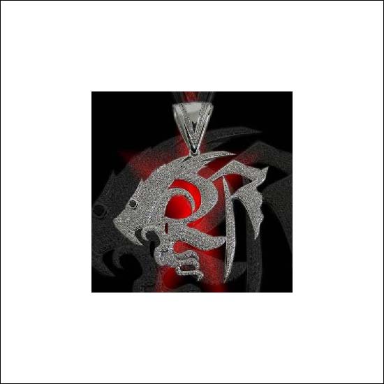 A diamond pendant in silver colour is in the form of a simplified dragon head and a claw