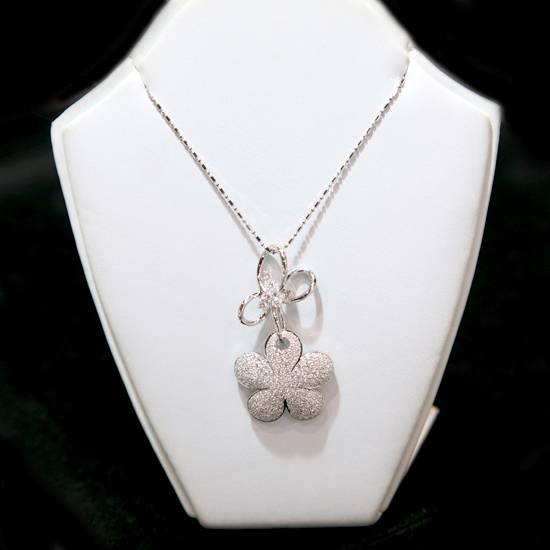 This pendant features a flower-like pattern hung on three oval-shaped golden pieces. The sparkling flower is covered with loose diamonds. The three hollow golden pieces above the flower resemble leaves, making the whole pendant look so natural. Although not in green, it is enough to reflect its ultimate beauty and natural feeling.