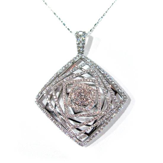 This is a diamond pendant set in 18k white gold. It features diamonds in prong setting surrounded by mutliple layers of squares set with small white diamonds. The split bail of the pendant is decorated with two rows of diamonds graduated in size.