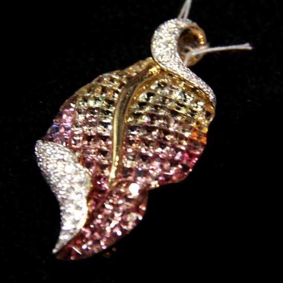 This is a delicately crafted diamond pendant. The pendant features a gracefully curled frame set with colorful diamonds for maximum sparkle. This diamond pendant makes a stylish way to enhance your jewelry collection.