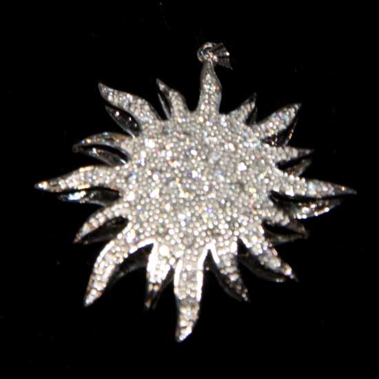 The twinkling pendant touts a unique and creative design finely encrusted with shiny 18K gold. Adorned with dazzling diamonds, the alluring pendant radiates a glow of sparkling beauty. The charming pendant is excellent for embellishing your evening ensemble.