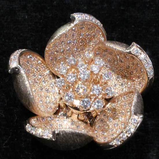 Displayed here is a pendant with an 18K rose gold setting. It is adorned with 391 pieces of glittering diamonds. The floral design conveys a touch of elegance and beauty.