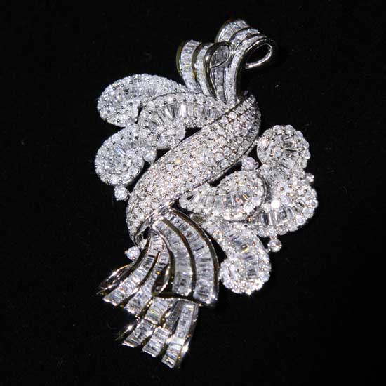 This is a spectacular pendant designed in a unique curvy shape. The white gold setting is paved all over with white diamonds. The diamonds come in various cuts to exude irresistible dazzles.