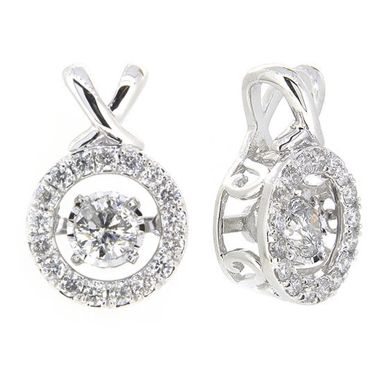 This is a pendant with a dainty and sparkling look. It features a sophisticated white gold mounting and a bigger round diamond centerpiece. This pendant is also paved with smaller diamond elements for added charm.