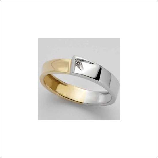 Design of a ring with half white gold and half yellow gold ringband.