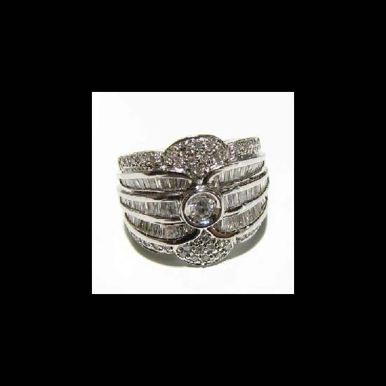 The ring is designed with transparent baguettes on the channel set
