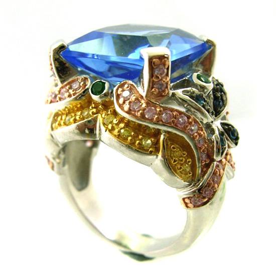 This ring features a special design on top. A mix cut gemstone is supported by the irregular but colourful pattern underneath. Beads are added to the underneath pattern to enhance the elegancy of the whole piece. The blue gemstone comes with 4-prong setting, the ring resembles a hand lifting up the gemstone to dedicate it to someone.