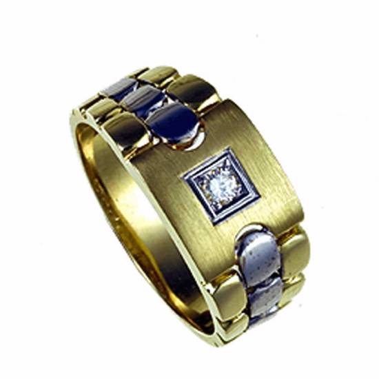 This is a diamond ring for gentlemen. It is made of yellow gold and white gold with a round diamond atop. It is designed with the pattern of a steel watch band.