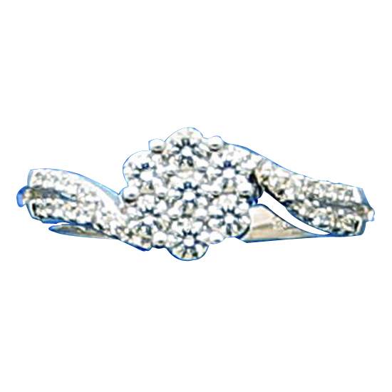 This is a diamond ring set in white gold. The ring features six round white diamonds in prong setting. The split shoulder of the ring is decorated and set with small round white diamonds.
