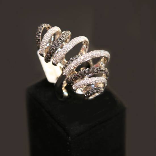 This is a diamond ring in brilliant cut. The setting of this ring has a fancy design with alternating lines of white and black diamond beads covering the multi-spiral pattern. This is an eye-catching and a glamorous ring which perfectly accompanies elegant clothing.
