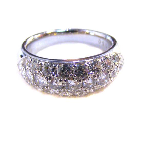 This is a diamond ring with a platinum ring body. Round diamonds with over excellent cut are set on the upper half of the ring band, making it an elegant and glamorous jewellery item for every lady.