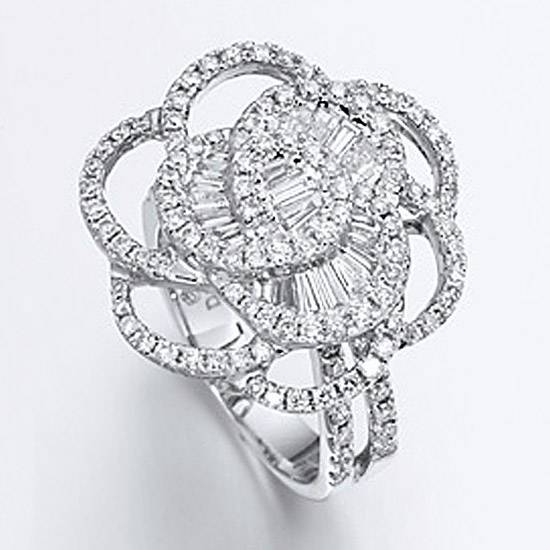 This ring flaunts a distinctive floral shape with sparkling diamonds. The highly-polished silvery surface reflects a lustrous sheen. It allows you to step out in absolute sophistication.
