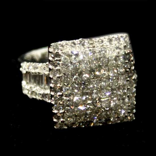 This diamond ring comes in a special and eye-catching square shape. The loose diamonds are arranged neatly for extra glitter. This diamond ring comes with a polished frame.