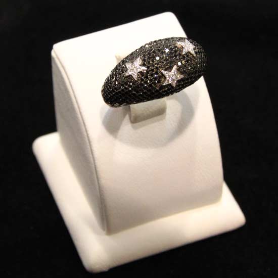 This exquisite ring features a marquise band embedded with glittering stones, shining with radiance in a mysterious black shade. Among them features several star-shaped diamonds, dazzling with the same allurement in white complexion. The shining stars in the dark night makes the ring more eye-catching than ever.