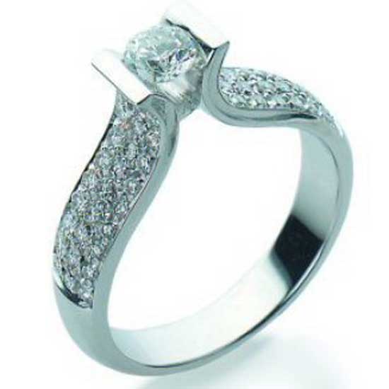 This diamond ring features a uniquely shaped band. It is highlighted by a round glittering diamond, which is delicately cut to give out the greatest sparkles. Match your formal outfit with this splendid ring.