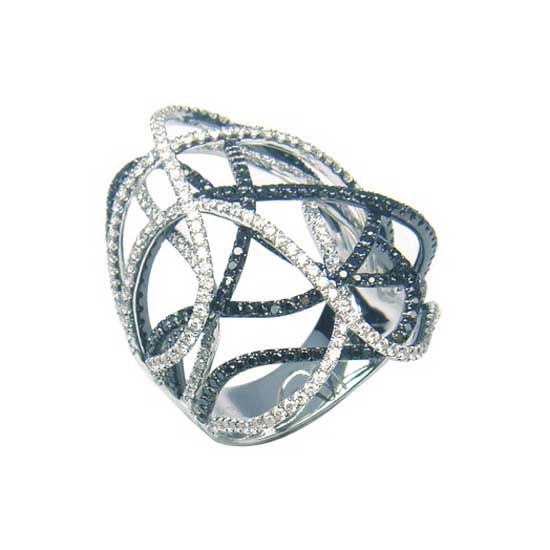 The diamond ring features a unique spherical shape. It comes with finely polished 18K gold construction. This ring is decorated with black and white diamonds for added style.