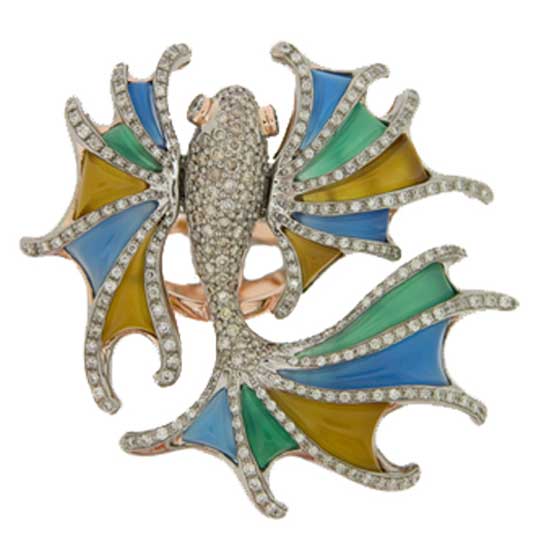 Displayed is a ring with a dramatic and colorful fish design. Made with colored diamonds, jade, 18K gold and 585 palladium, this ring simply suggests exotic elegance. Add a playful touch to your outfit with this ring on your finger.
