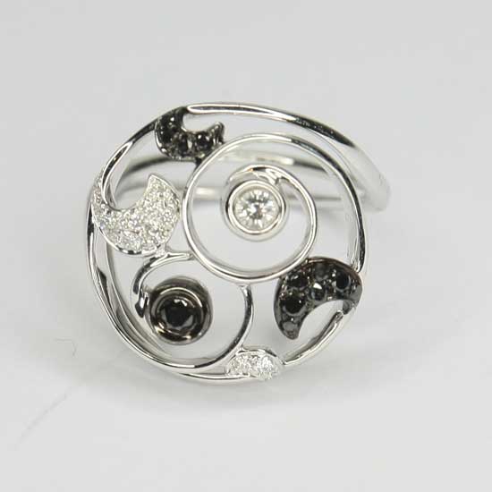 This diamond ring is composed of curved elements for a gracious style. The black and white diamonds are carefully cut for maximum light return. Add this exquisite ring to your jewelry collection.