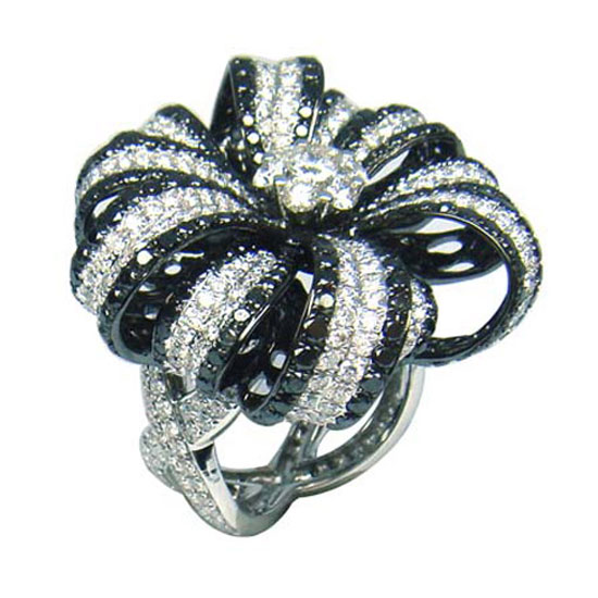 The delicate diamond ring features a floral-shaped design for a feminine touch. It is adorned by black and white diamonds to give a glittering appearance. Slip this ring on to complete your beautiful evening look.