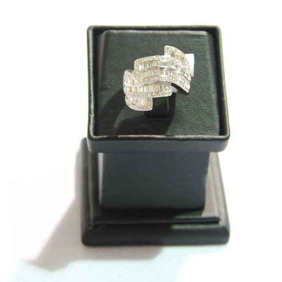 Showcased is a diamond boasting a sophisticated style. The ring is designed in a unique shape, which is embellished with sparkling diamonds. The white gold setting comes with a shiny finish for an impressive appearance.