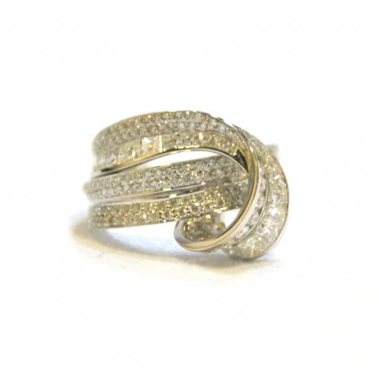 Presented is a ladies’ ring boasting an exquisite design. The curvy setting is paved all over with loose diamonds to exhibit a classy style. This diamond ring makes a dazzling choice for mix and match.