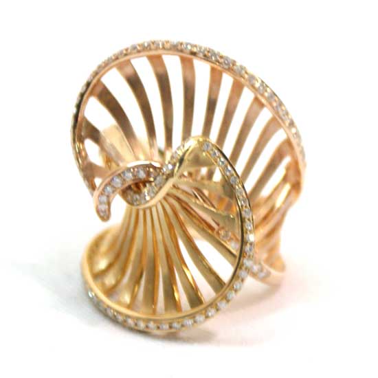 Showcased is a diamond ring with a spiral design. It flaunts 18K rose gold casting for added luster. This diamond ring is set with sparkling diamonds for breathtaking beauty.