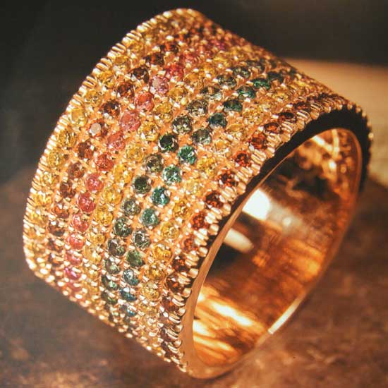 This luxurious finger ring in yellow gold features 8 lines of fancy diamonds for an eye-catching look. The excellent craftsmanship brings out maximum luster and shine from the diamonds. This sparkling finger ring is a great gift for your loved one.