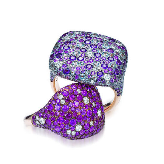 - Rings in 18kt gold: the above one is red gold with white diamonds, blue topazes and amethysts. The one below is in red gold with white diamonds, pink sapphires and rubies.