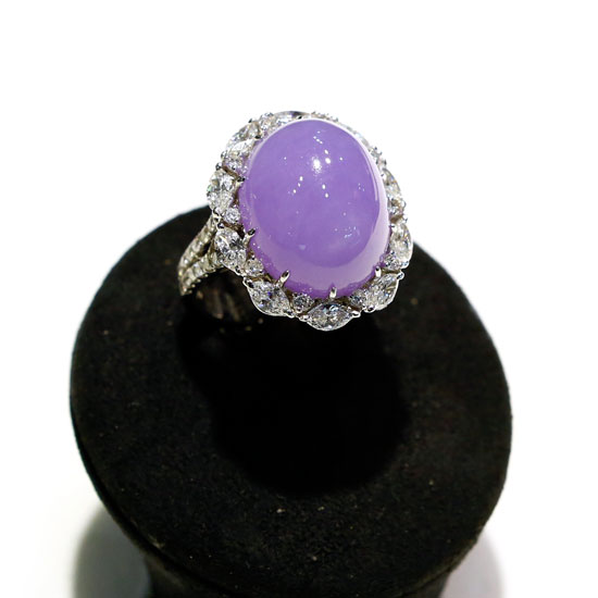 This is a glamorous finger ring that is finely crafted with refined details. It is accented with a large oval-shaped jade gemstone as the centerpiece. The allover dazzling white diamonds are well paved on the silver-toned setting.