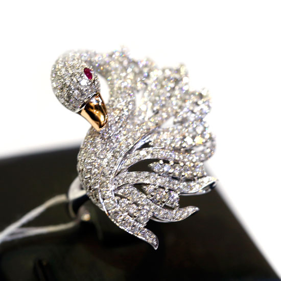 This is a gorgeous finger ring that boasts a vivid and attractive swan appearance. It is finely accented with dazzling white diamonds for a touch of luxuriousness. This glamorous ring is finished with an 18-karat white gold structure.