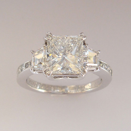 This ring with a square-cut diamond center stone will captivate anyone's heart. It is accented by 0.5-1 carat of sparkling diamonds around the shoulders for added glamour. The splendid design makes it a perfect engagement or bridal ring.