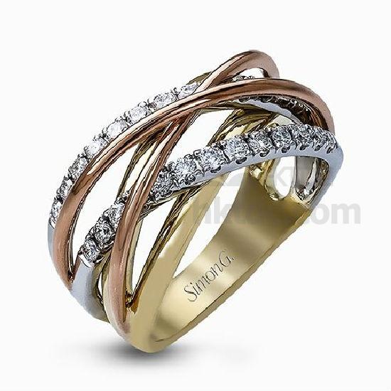 Featuring a distinctive contemporary intertwined design, this three-tone band is accentuated by .52 round cut white diamonds set in yellow, white and rose gold.